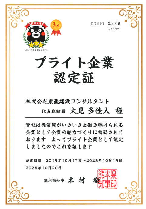 熊本県よりブライト企業の更新認定を受けました