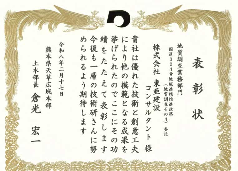 令和8年2月17日、熊本県天草広域本部より、弊社が実施した「国道324号地域連携推進改築(地質調査その4)委託」が、地質調査業務部門において表彰されました。